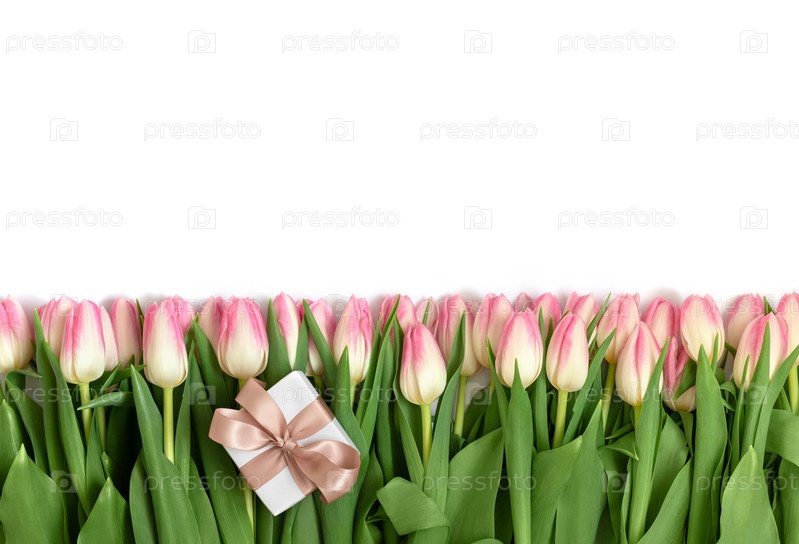 Граница с розовыми цветами тюльпаны и подарочная коробка, изолированные на белом фоне. День святого Валентина, концепция Дня матери. Скопируйте пространство, вид сверху