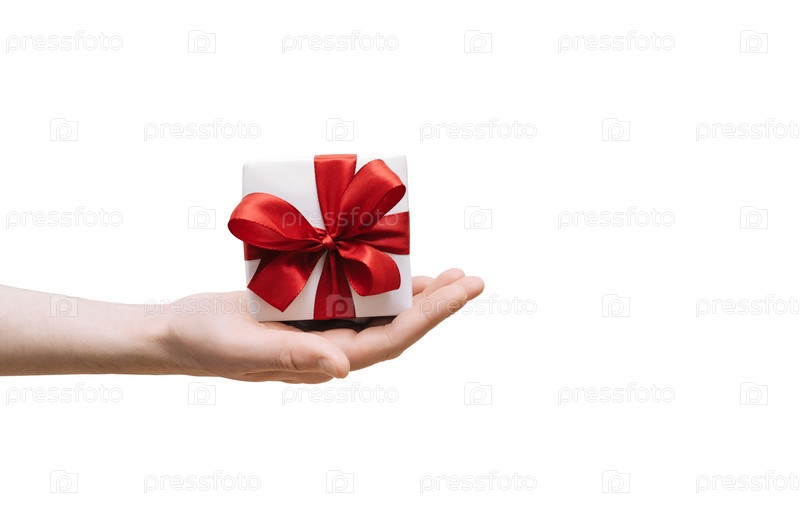 Подарок с красным бантом в руке, изолированные на белом фоне. Мужская рука держит подарок. Концепция любви. Скопируйте пространство