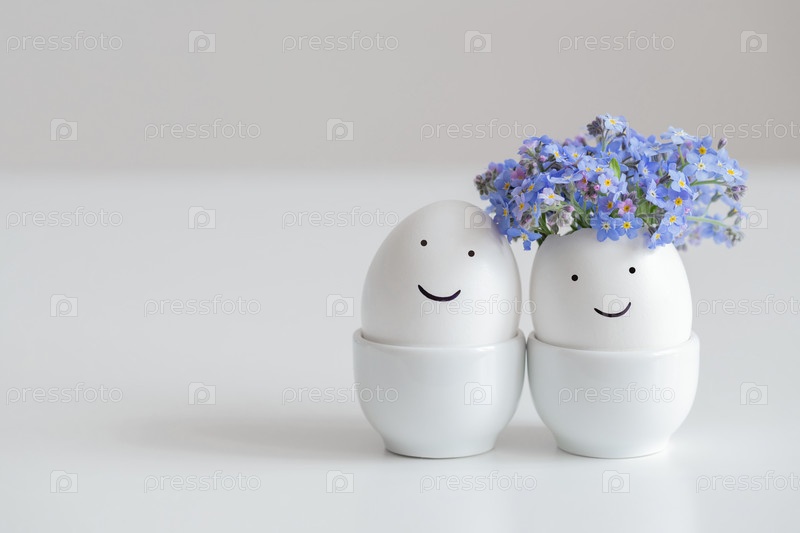 Пара забавных яиц с раскрашенными лицами на белом фоне. Пасхальные яйца с цветами. Концепция любви. Место для текста