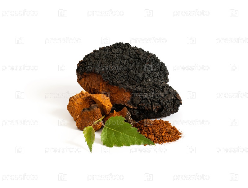 Гриб чага, изолированные на белом фоне. Измельченные кусочки чаги, порошок чаги и зеленый березовый лист