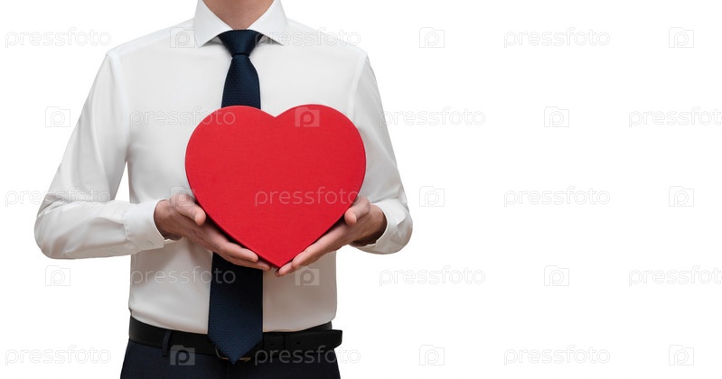 Мужчина держит большое красное сердце, изолированное на белом фоне. Концепция любви и Дня святого Валентина. Баннер. Копировать пространство