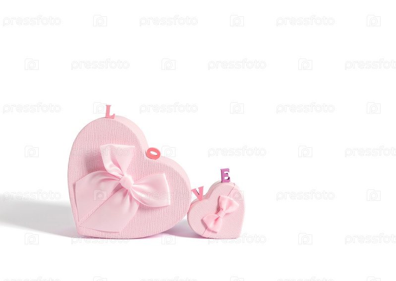 Розовые подарочные коробки сердца и любовь надпись, изолированные на белом фоне. День святого Валентина, день матери, поздравительная открытка на день рождения. Копировать пространство