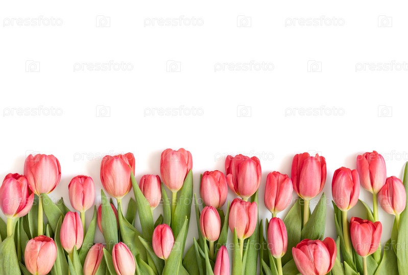 Красивая цветочная композиция, изолированные на белом фоне. Граница красных тюльпанов. Пасхальные розовые тюльпаны. День святого Валентина, концепция Дня матери. Скопируйте пространство, вид сверху