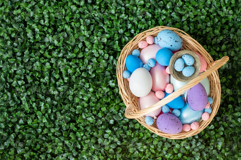 Пасхальная корзина с яйцами на зеленой лужайке. Пасхальная композиция. Праздничная охота за яйцами. Скопируйте пространство, вид сверху, плоская планировка