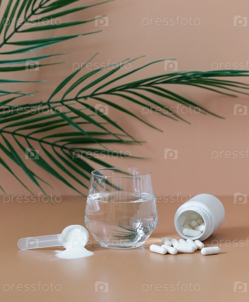 Коллаген на бежевом фоне с зелеными листьями. Коллагеновый протеиновый порошок и таблетки крупным планом. Натуральная добавка для здоровья и красоты. На рыбной или растительной основе. Вертикальная ориентация