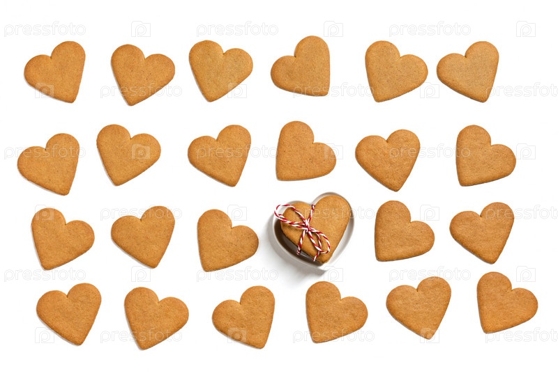 Романтический узор с имбирным печеньем в форме сердец, изолированных на белом фоне. Фон печенья на день святого валентина. Концепция любви. Вид сверху