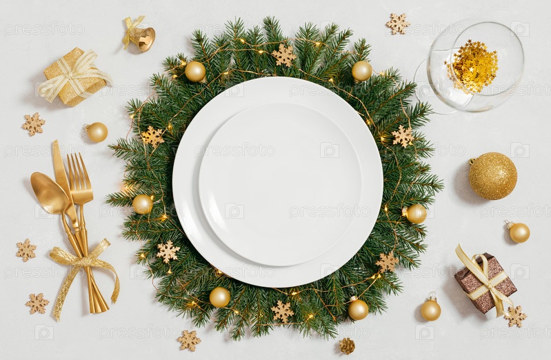 Рождественская пустая сервировка стола с золотыми аксессуарами на сером фоне. Вид сверху. Место для текста