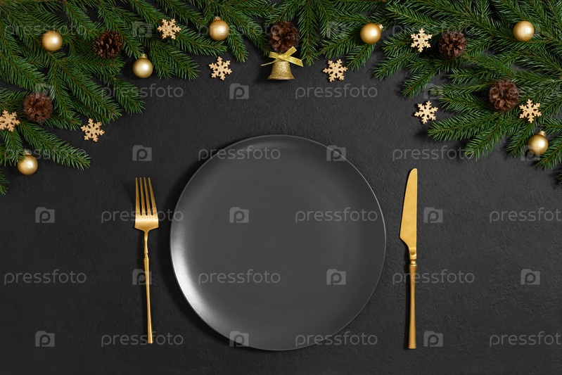 Черная рождественская сервировка с золотым праздничным декором и еловыми ветками. Новогодняя сервировка с пустой черной тарелкой. Скопируйте пространство, вид сверху, плоская планировка
