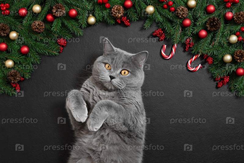 Рождественский кот на черном фоне. Британский кот с праздничными рождественскими украшениями. С Новым Годом. Вид сверху. Место для текста. Символ китайского Нового 2023 года