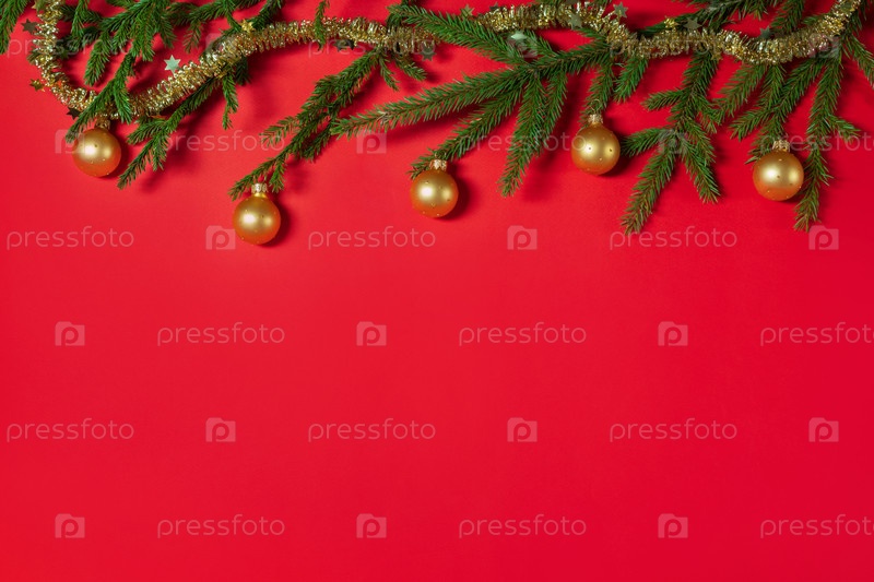 Рождественский бордюр из еловых веток и золотых шаров. Рождественский красный фон. Плоская планировка, вид сверху, пространство для копирования. Рождественская концепция