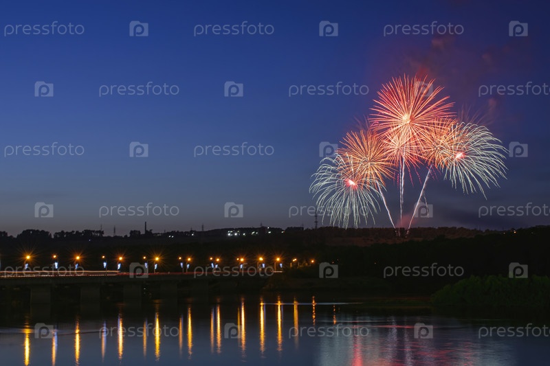 Фейерверк на фоне ясного ночного неба у реки и моста