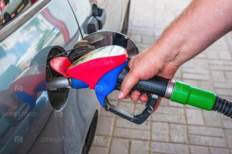 Водитель заправляет дорогой бензин в топливный бак автомобиля