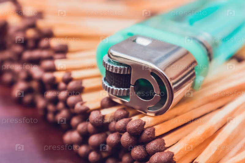 Карманная зажигалка лежит на куче спичек