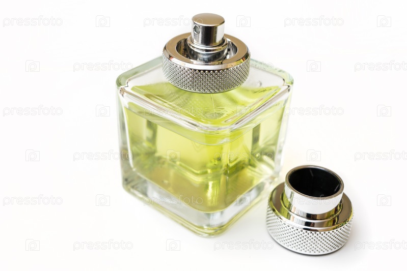 Бутылка ароматных духов зеленого цвета на белом фоне с открытой крышкой