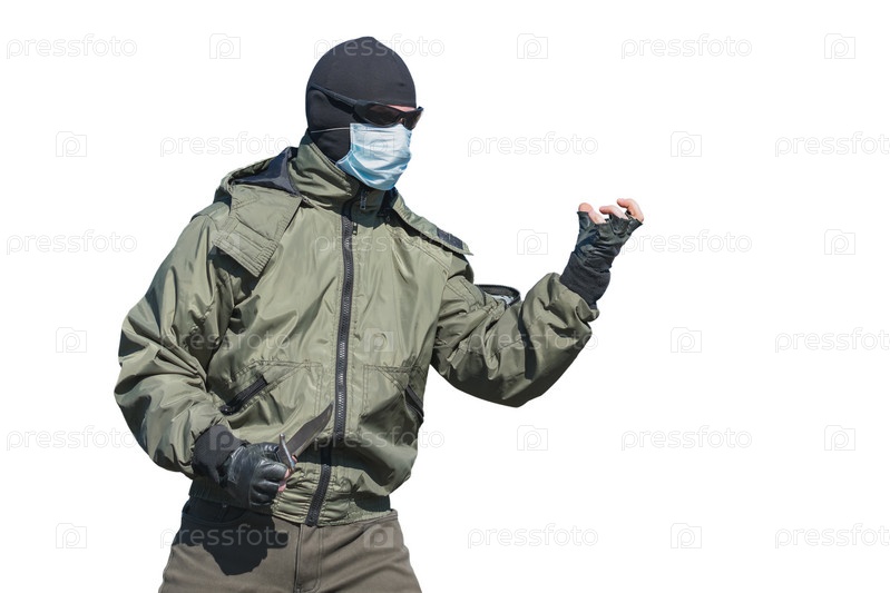 Бандит в балаклаве и медицинской маске в виде изолята на белом фоне