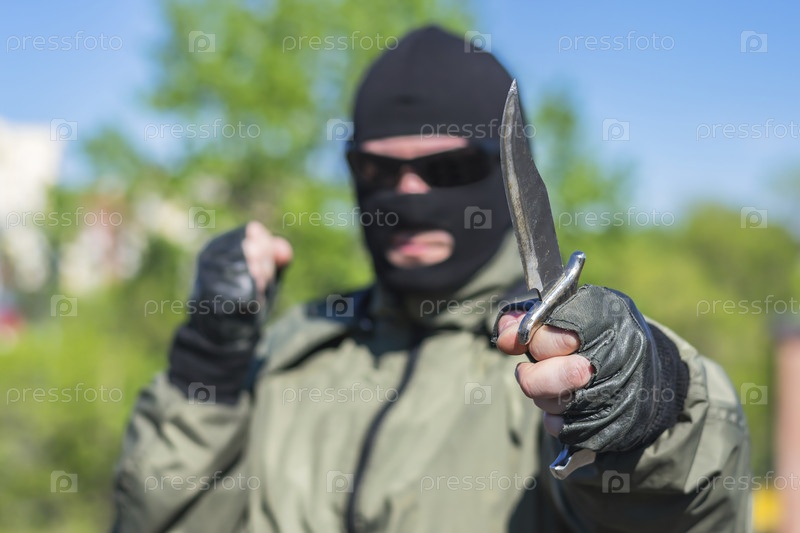 Охотничий нож в руках мужчины в балаклаве