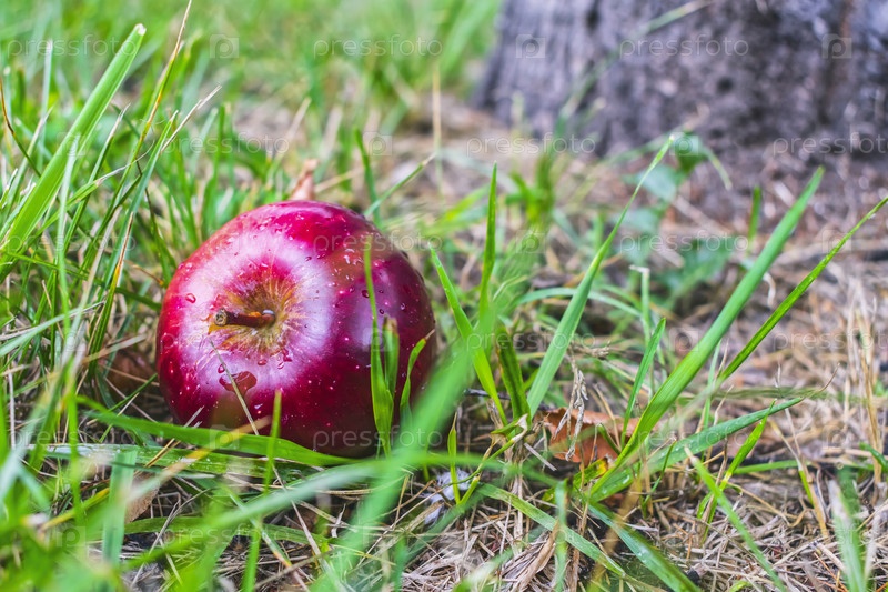 Большое красное и спелое яблоко упало с дерева на землю