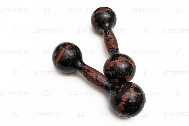 Пара старых спортивных гантелей для силовых тренировок на белом фоне