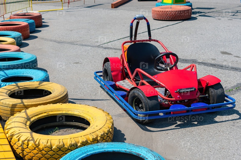Открытый картинг и красный электрический спортивный автомобиль на гоночной трассе, оборудованной защитными бордюрами из старых шин