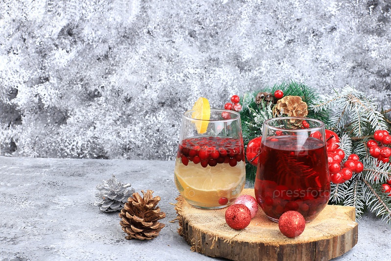 Алкогольный или безалкогольный коктейль из мандаринов, апельсинов, яблок и корицы со специями, глинтвейн, согревающий зимний напиток в холодное время года, рождественский праздничный грог, зимняя композиция с украшениями, место для текста