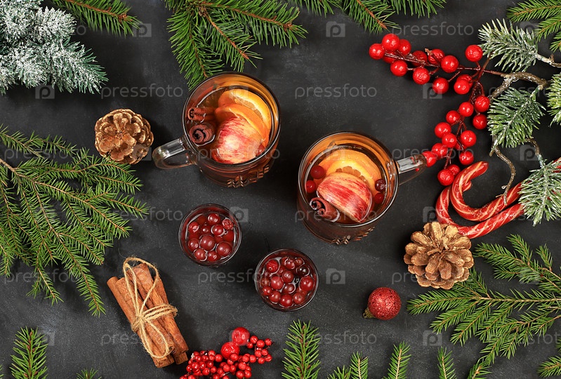 Водка с клюквой и глинтвейн на праздничном столе с еловыми ветками и украшениями, крепкий алкогольный напиток, зимняя композиция, рекламная открытка для бара, кафе, ресторана, праздник Рождества и Нового года