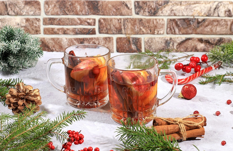 Алкогольный или безалкогольный коктейль из мандаринов, апельсинов, яблок и корицы со специями, глинтвейн, согревающий зимний напиток в холодное время года, рождественский праздничный грог, зимняя композиция с украшениями, место для текста