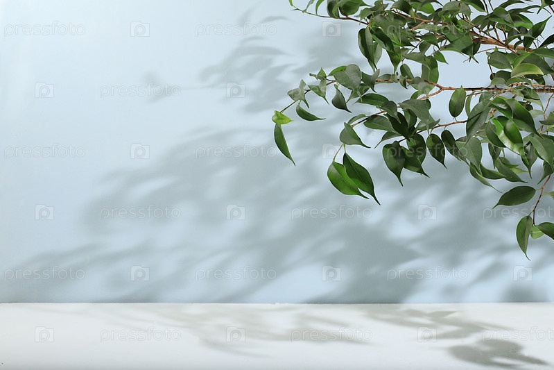 Пустая витрина для демонстрации или презентации косметических продуктов, сцена для дизайна, абстрактный фон с тропическими листьями и тенями, современный креативный дисплей, выборочный фокус