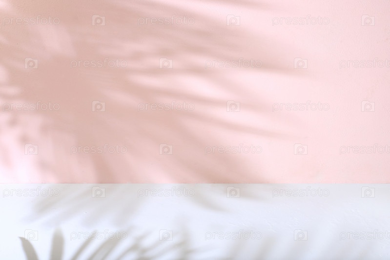 Пустой подиум премиум-класса с тенями тропических пальмовых листьев на розовой стене, минимальный абстрактный фон для презентации косметических продуктов. шаблон для дизайна, подиум пьедестала, выборочный фокус