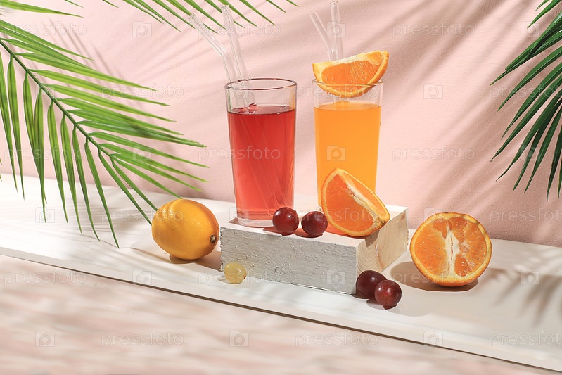 Современный натюрморт с цитрусовым, апельсиновым и виноградным соком, апельсинами и виноградом на пастельном фоне с длинными жесткими тенями, концепция минимальной детоксикации, летние витаминные напитки, избирательный фокус, место для текста