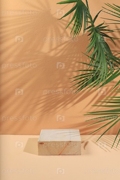 Абстрактный фон с натуральными деревянными подиумами и длинными тенями на розовой стене, пустая витрина для демонстрации или презентации косметических продуктов, минимальная экологическая концепция, избирательный фокус