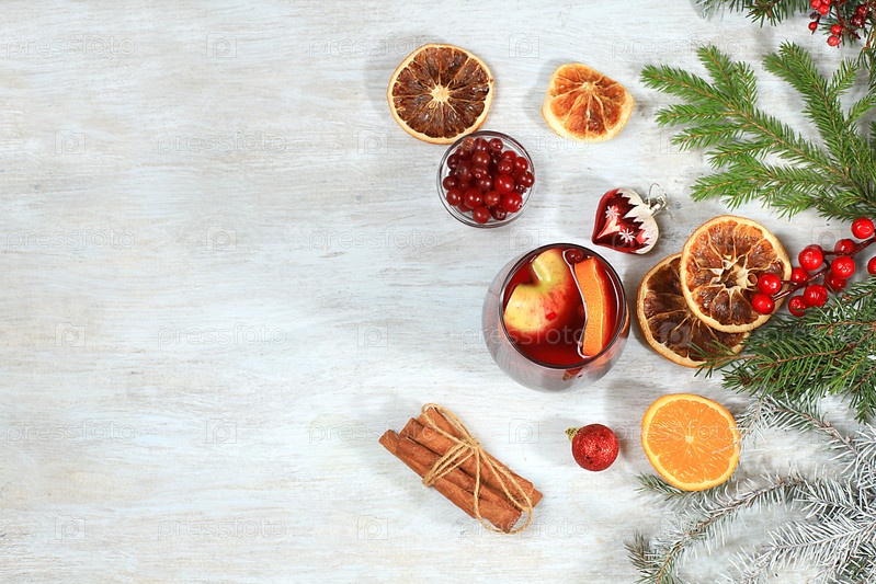 Алкогольный или безалкогольный коктейль из мандаринов, апельсинов, яблок и корицы со специями, глинтвейн, согревающий зимний напиток в холодное время года, рождественский праздничный грог, зимняя композиция с украшениями, место для текста