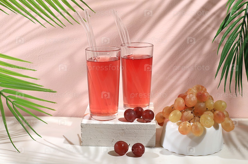 Современный натюрморт с цитрусовым, апельсиновым и виноградным соком, апельсинами и виноградом на пастельном фоне с длинными жесткими тенями, концепция минимальной детоксикации, летние витаминные напитки, избирательный фокус, место для текста