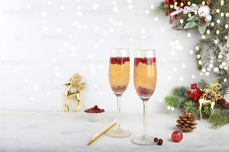 Рождественский алкогольный коктейль со специями из клюквы и корицы, коктейль "Мимоза" с шампанским, согревающий зимний напиток в холодное время года, рождественский праздничный грог, зимняя композиция, избирательный фокус