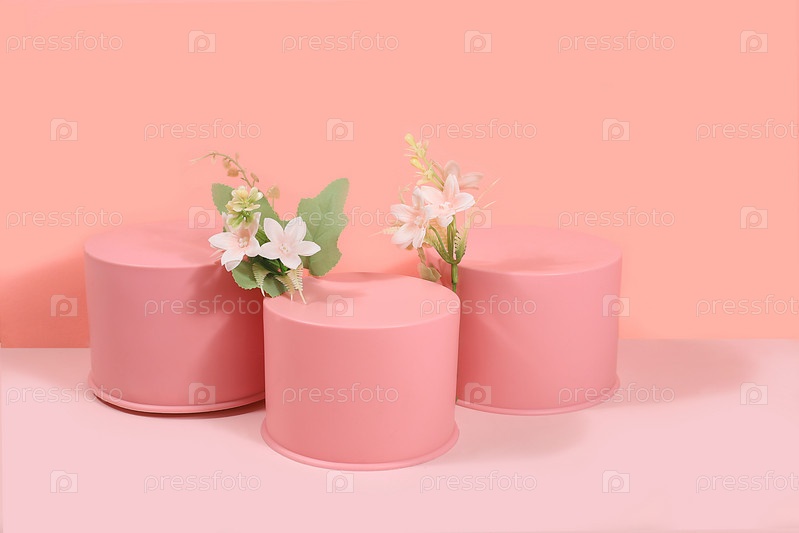 Абстрактный фон с красочными круглыми подиумами, пустая витрина для демонстрации или презентации косметических продуктов, сцена с геометрическими фигурами с местом для текста, минимальная экологическая концепция, избирательный фокус