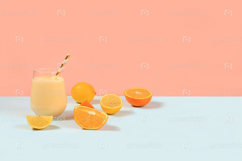 Современный натюрморт с цитрусовыми, апельсиновым смузи и ингредиентами на розовом фоне с тенями, концепция минимальной детокс-диеты, летние витаминные напитки, избирательный фокус, место для текста