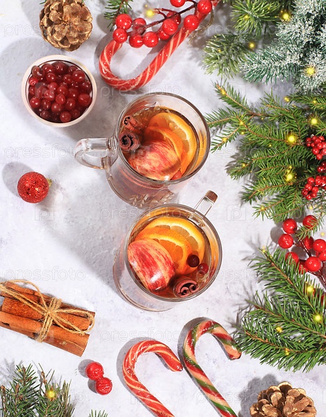 Алкогольный или безалкогольный коктейль из мандаринов, апельсинов, яблок и корицы со специями, глинтвейн, согревающий зимний напиток в холодное время года, рождественский праздничный грог, зимняя композиция с украшениями, место для текста