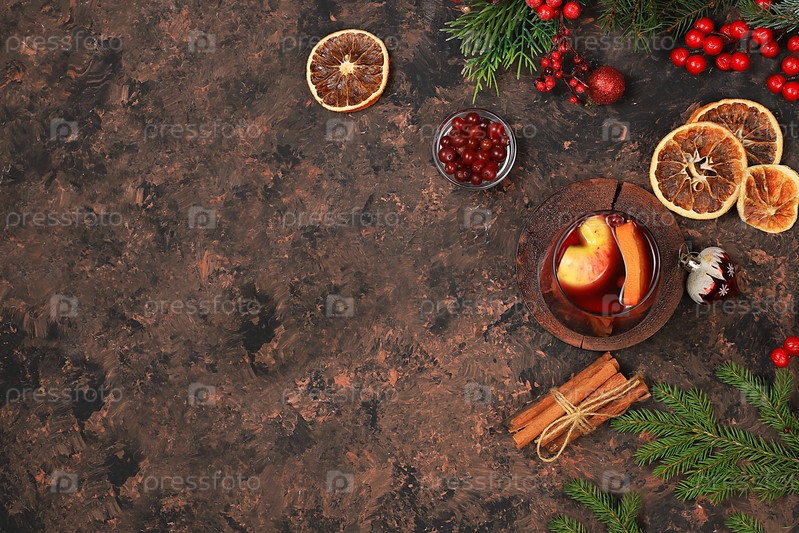 Алкогольный или безалкогольный коктейль из мандаринов, апельсинов, яблок и корицы со специями, глинтвейн, согревающий зимний напиток в холодное время года, рождественский праздничный грог, зимняя композиция с украшениями, место для текста