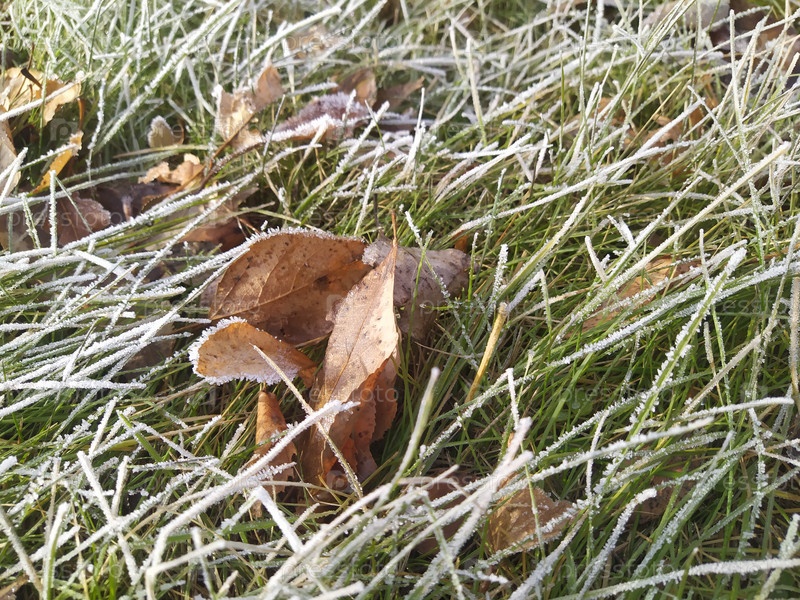 Зеленая трава и опавшие листья утром покрыты инеем. Осень. Первые морозы