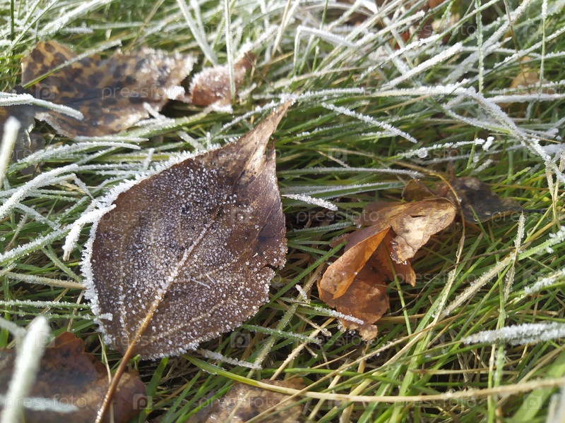 Опавшие листья и зеленая трава утром покрытые инеем. Осень. Первые морозы. Раннее морозное утро