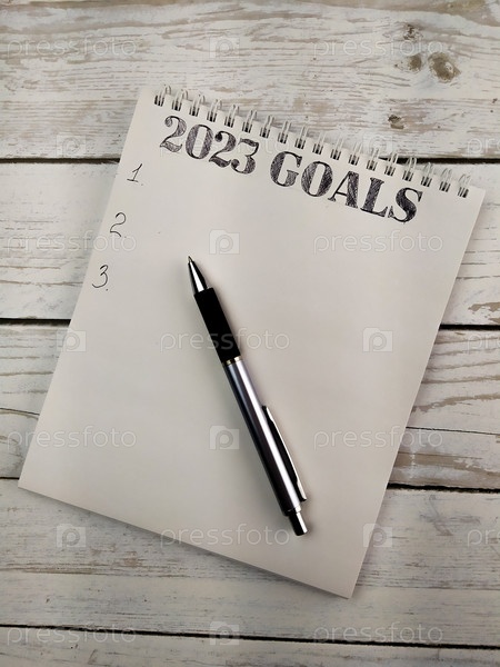 Цели на 2023 год написаны в блокноте на чистом листе, на нем лежит ручка, а рядом стоит кружка кофе, на светлом деревянном фоне