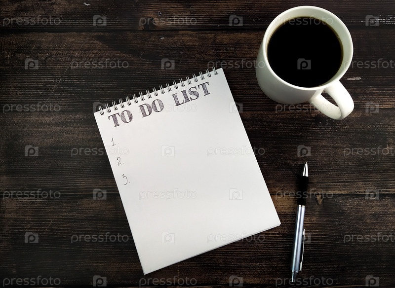 Список дел написан в блокноте, рядом ручка и планшет, кружка кофе на деревянном фоне. Планирование