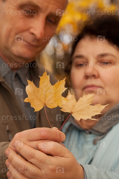 Пожилая пара с кленовыми листьями в руках