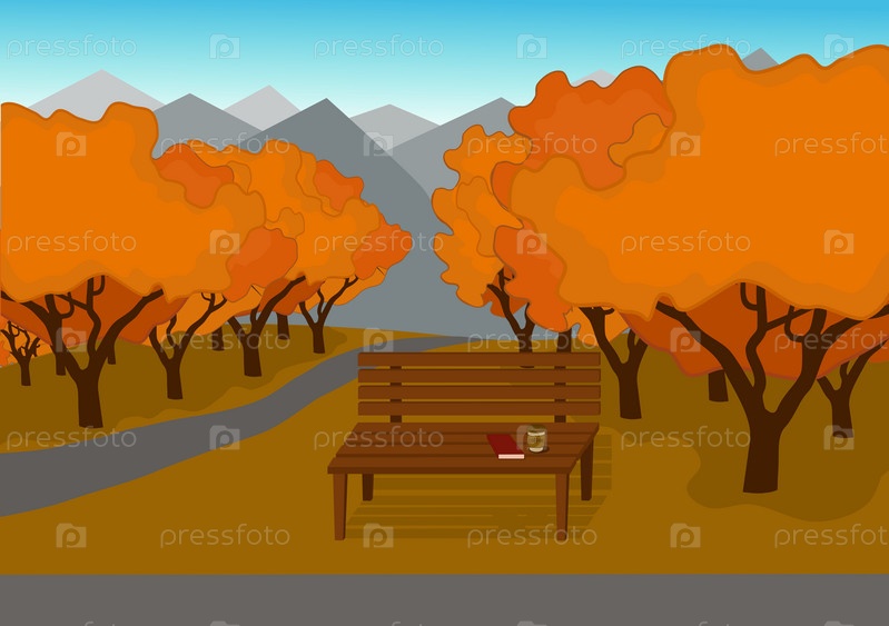 Осенний пейзаж. В национальном парке стоит скамейка, на которой стоит стакан кофе и книга. Вокруг осенний оранжевый лес. Дорожка уходит в горы. Горы на заднем плане
