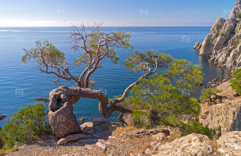 Причудливо изогнутые реликтовые сосны на морском берегу. Крым, Новый Свет