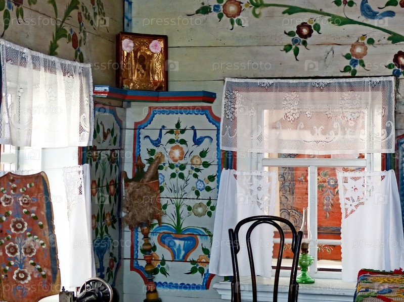 Красный угол в горнице. "Чистая (белая)" часть крестьянского дома. Уральская роспись – участие народный промысел. Музей-заповедник деревянного зодчества и народного творчества. Нижняя Синячиха, Россия