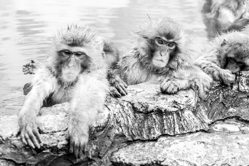 Группа снежных обезьян сидит в горячем источнике в парке обезьян Джигокудани в Японии, префектура Нагано