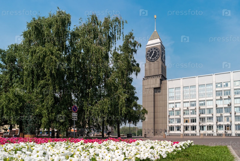 Вид на городские часы. Башня с часами возле администрации в Красноярске, Россия