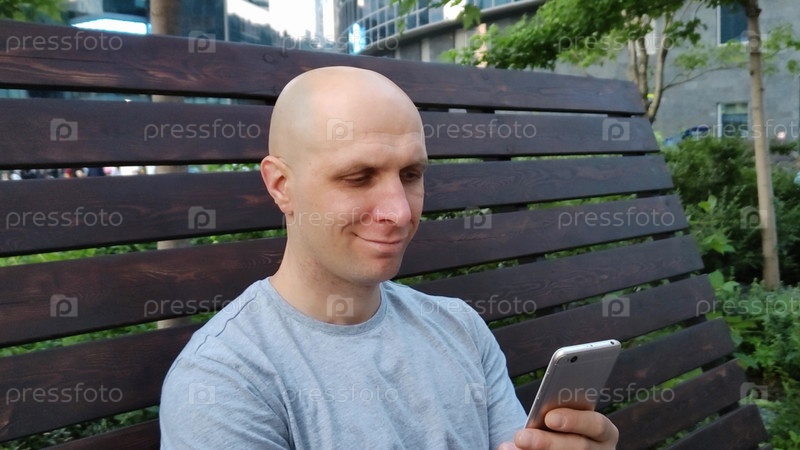 Привлекательный лысый мужчина улыбается, глядя на экран своего мобильного телефона. Красивый молодой человек использует смартфон для общения, работы и отдыха. Парень сидит на скамейке. Счастливый человек, получающий хорошие новости по мобильному телефону.