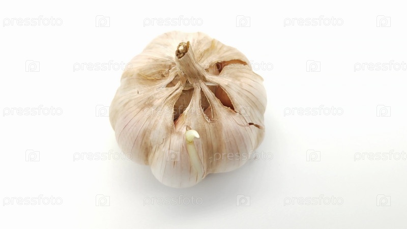 Головка чеснока на белом фоне. Проросший чеснок. Осенний урожай овощных культур. Крупный план, изолированный, вид сверху