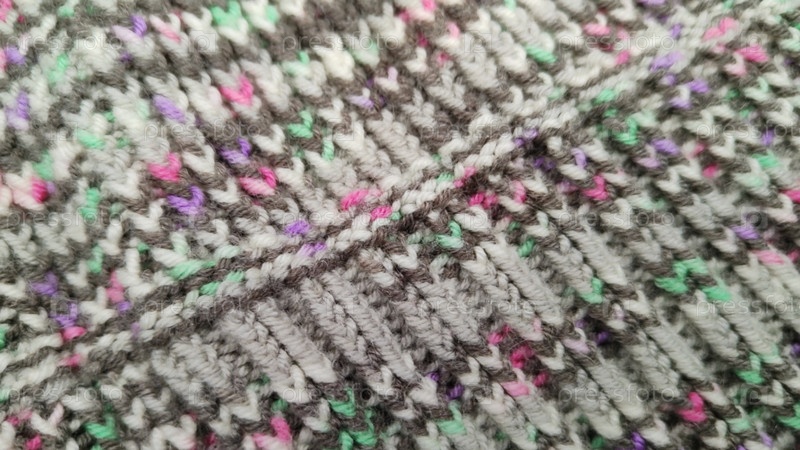 Вязаный шерстяной фон из меланжевой пряжи. Настоящая текстура трикотажного полотна. Различные виды вязания. Макросъемка из мягкой шерсти. Крупный план